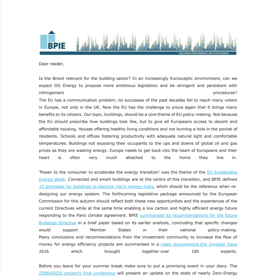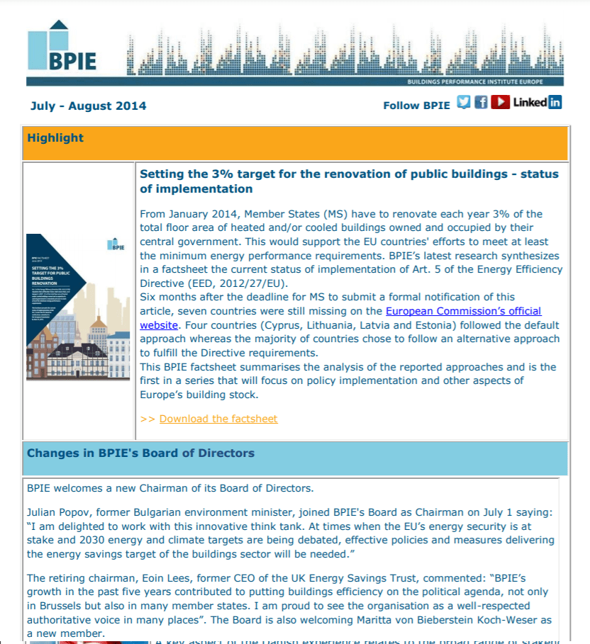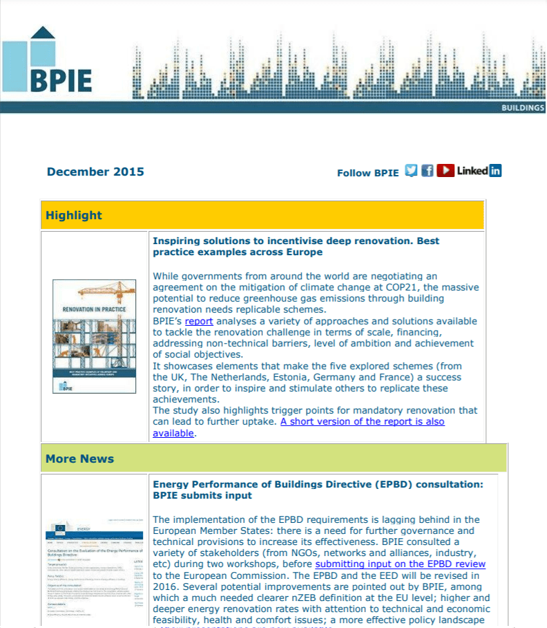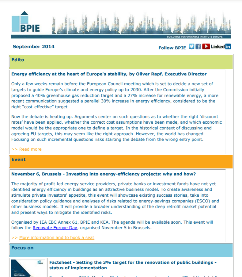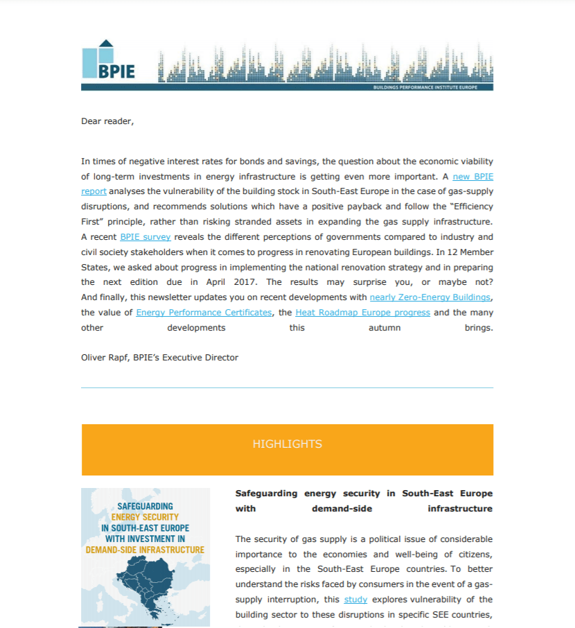• On September 28 and 29, BPIE will speak at the regional workshop “Accelerating Building Efficiency: Challenges and opportunities in Central & Eastern Europe” in Belgrade, organized by the Buildings Efficiency Accelerator and the UN Environment Programme.